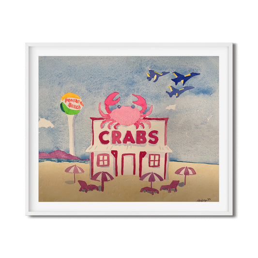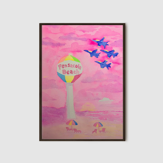Pink Pensacola Beach Ball and Blue Angels Sunset Watercolor Print